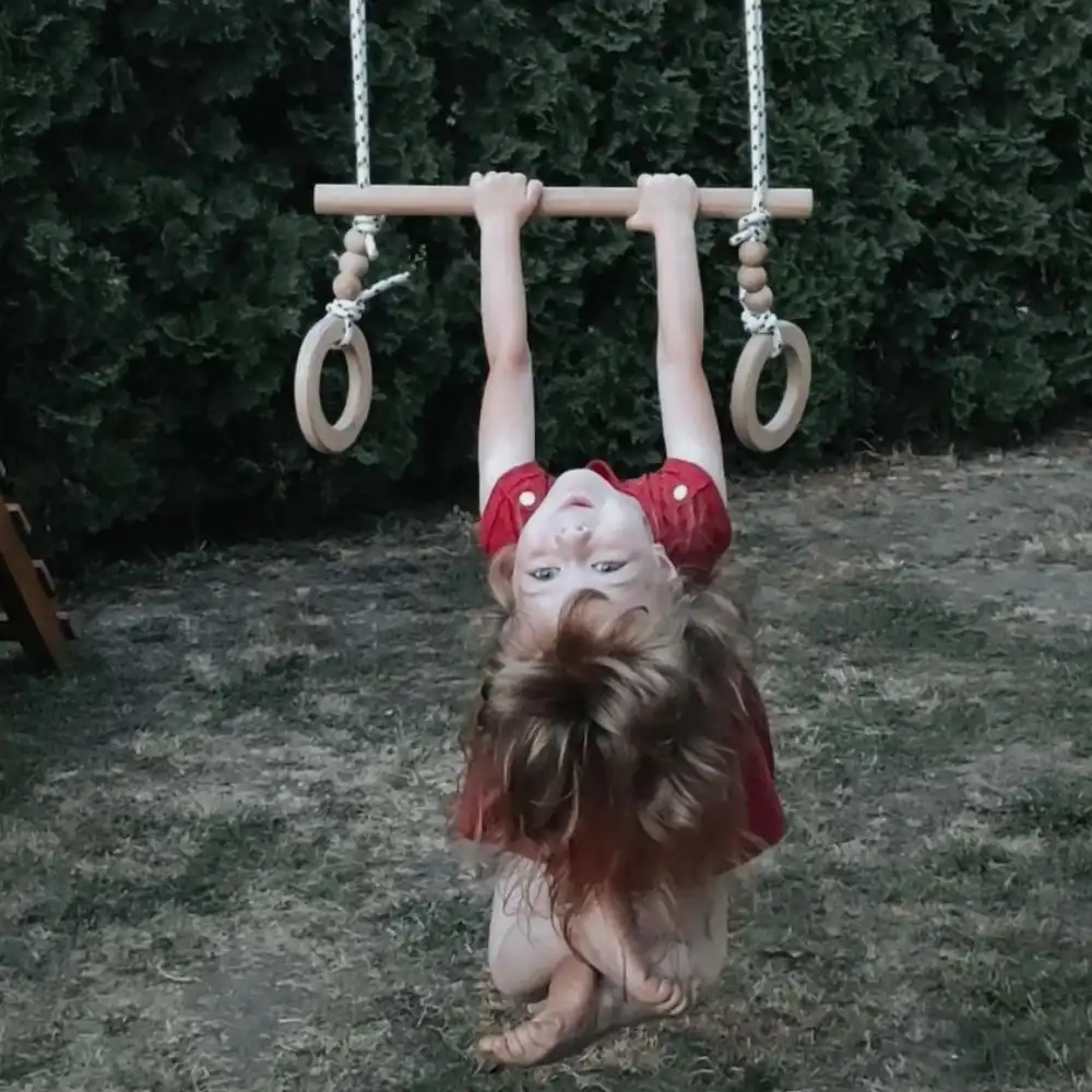 Trapez ljuljaška od bukovog drveta odlična za zabavu u sobi ili dvorištu. Podesiva tako da se karike i šipka mogu i odvojeno koristiti. Idealna za vežbanje motorike, snage i izdržljivosti i predstavljaće pravu zabavu Vašem mališanu. U setu dolaze i kuke za kačenje.